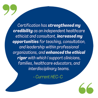 The HEC-C credential is a valuable asset to both practicing healthcare ethics consultants and those serving in leadership roles within their institutions' healthcare ethics initiatives. This certification program is the first of its kind. The program evaluates your knowledge and skills in assessing factual information about medical ethics concerns, analyzing the ethical questions at hand to resolve issues and conflicts, using consistent processes that adhere to healthcare ethics competencies, and evaluating the outcomes and implications of your consultations.